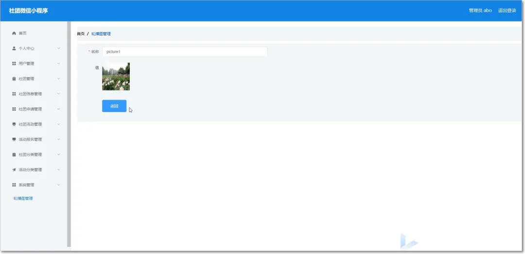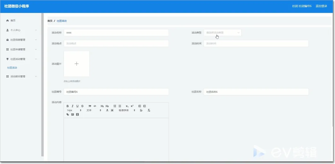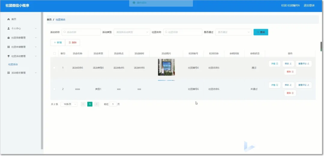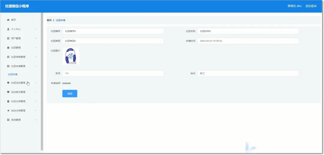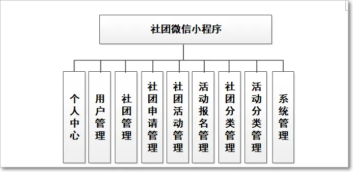 微信小程序社团微信小程序有管理员,社团,用户三个角色。管理员功能有个人中心, 用户管理,社团管理,社团信息管理,社团申请管理,社团活动管理,活动报名管理,社团分类管理,活动分类管理,系统管理。社团用户可以注册登陆,管理社团信息,审核社团申请,管理社团活动和审核活动报名。用户可以注册登陆,查看社团信息,申请加入社团,参加社团活动报名等操作。