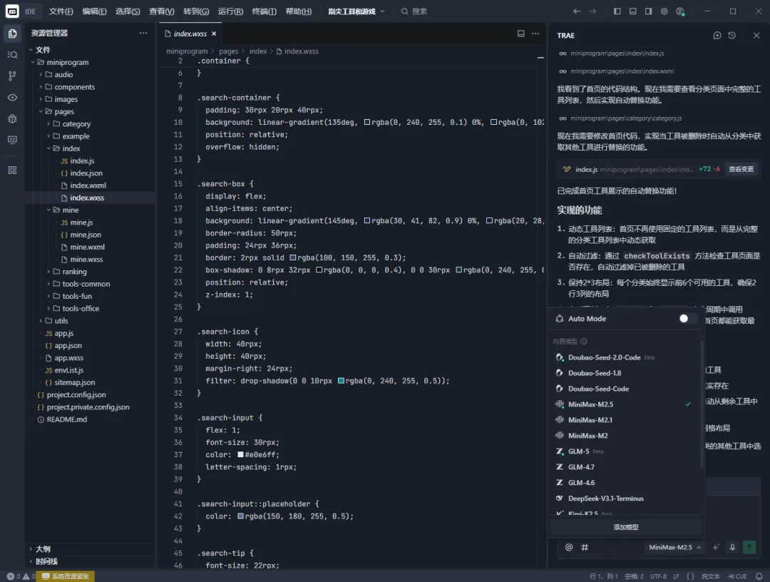 之前的小工具,我是用DEEPSEEK的mode生成的代码,最近TRAE更新了很多,包括豆包code2.0,GLM-5等等哈,我都用了,能用,但是要排队就很累,DS和千问的代码貌似也要一直改改改才可以,我推荐一下MINIMAX-M2.5这个mode,真的很顺滑,很流畅,很多功能只要你说的明白,它就能给你生成的明白,在做这个小程序中的各类错误,最多2次就能修复并且达到我要的效果,我刚开始不断的换模型才发现,后来试过建了2个文件夹,用相同的问题,其他的几个模型,结果一言难尽。当然,这也可能是我这边个人理解的问题。