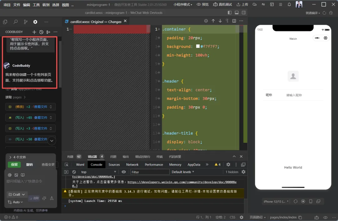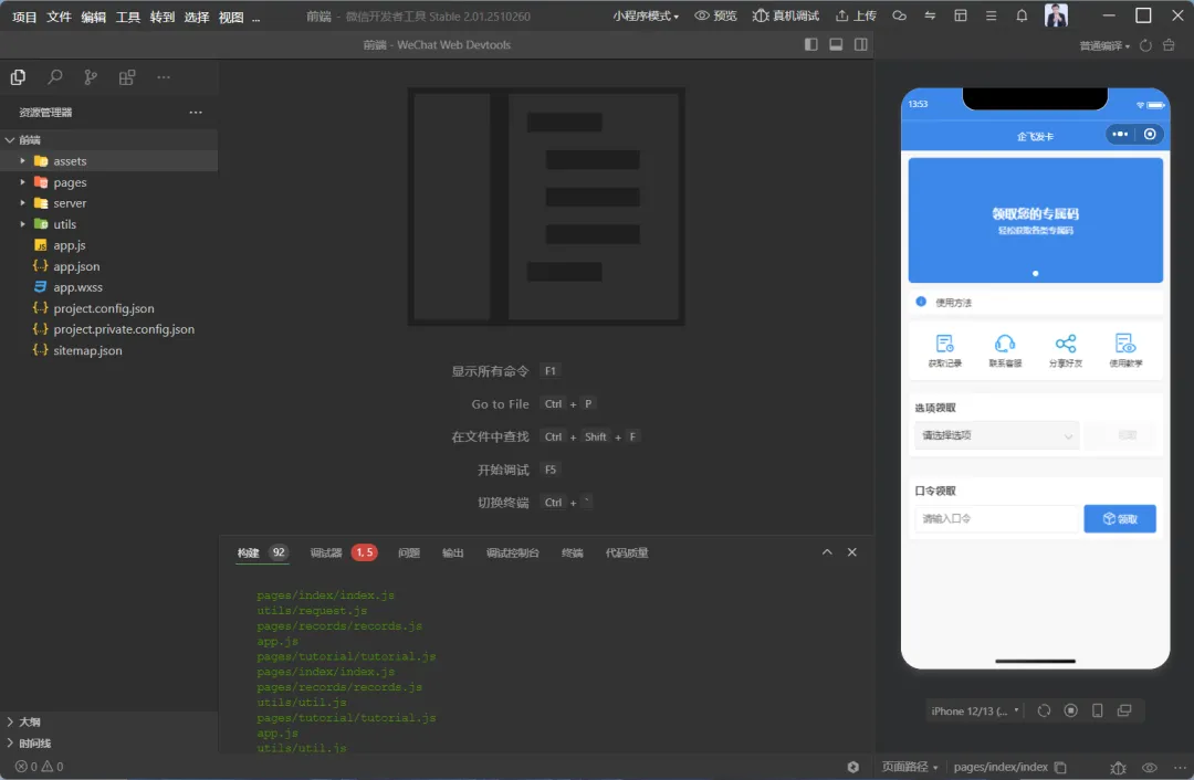“帮我写一个小程序页面,用于展示卡密列表,并支持点击领取。”AI就会生成页面结构、逻辑代码以及样式。如果出现错误,就继续让 AI 帮忙排查和修改。三、项目最初的功能构思