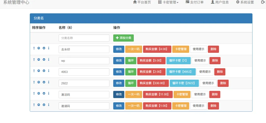 用于区分不同资源类型,例如软件工具、模板源码、账号资源等。2. 卡密系统
