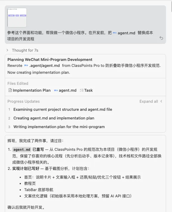以前找外包开发怎么也得三五千吧,特别惊喜,迫不及待想分享给大家。整个过程就三句话,你也能学会非常简单开发小程序把你对标要抄的小程序,直接截一张图发给AI然后说,参考这个界面和功能,帮我做一个微信小程序。