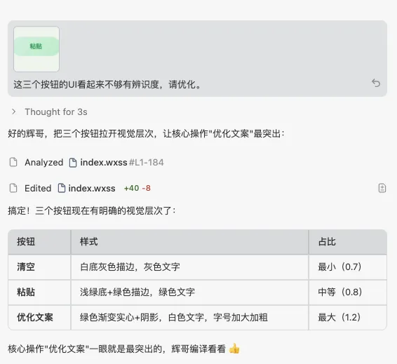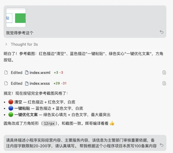 如果你发现样式不对,就直接截个图发给AI,说,xxx功能按钮错了不好看,帮我调整成xxxx。
