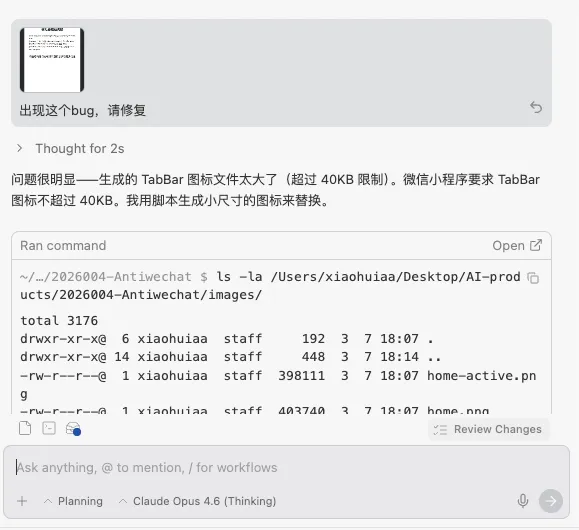 AI就会识别完成,修复bug。只要一个微信小程序功能不复杂,这样几个来回过后,就把功能给做好了。当核心功能开发完成,右上角先进行真机测试,安卓和苹果测试都没问题,那么就直接点击上传完成。