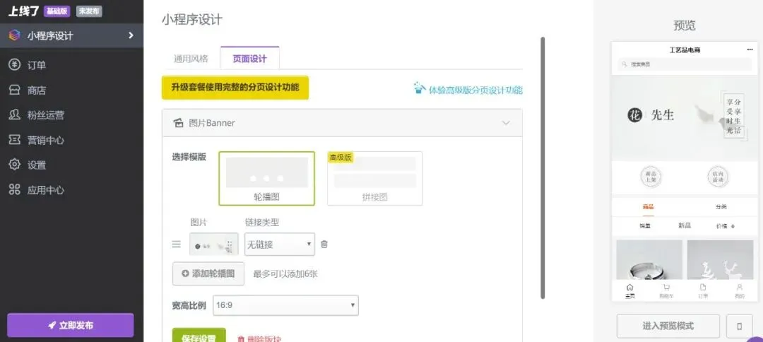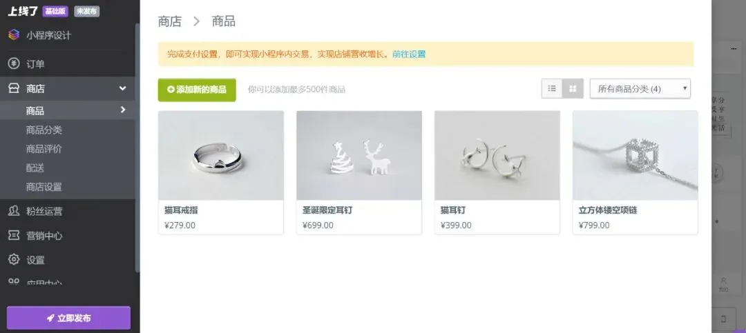 在【页面设计】里,你可以添加轮播图、拼接图、快捷按钮、视频、商品分类、视频、标题等版块。上线了自带有图库,如果你没有合适的图片来做图片banner、快捷按钮,那么就可以使用图库里的图片。点击左侧【商店】栏,你可以添加新的商品,设置商品分类、配送服务、开启商品评论。点击【粉丝运营】,你可以在这里创建会员系统,设置会员积分。点击【营销中心】可以添加优惠券、秒杀、拼团、分销系统等营销工具。如果想让小程序内容更加丰富,在【应用中心】你可以添加文章模块、直播功能,不过小程序直播需要有一定资质,具体要求和教程可以看这里。做好后可以预览小程序,各方面都没有问题后,点击左下角“立即发布”,然后按要求用小程序管理员账号授权(没有的话可以用“快速注册”通道注册一个),再等待微信审核就可以了。就是这么简单!你不用去管小程序源码怎么用,按照上述教程,即使是什么都不懂的纯小白,也可以非常快地搭建好一个小程序商城。如果你想制作自己的小程序,又不懂技术,那就可以试试这种方法。点击下方“阅读原文”,用「上线了」制作一个自己的小程序试试吧!