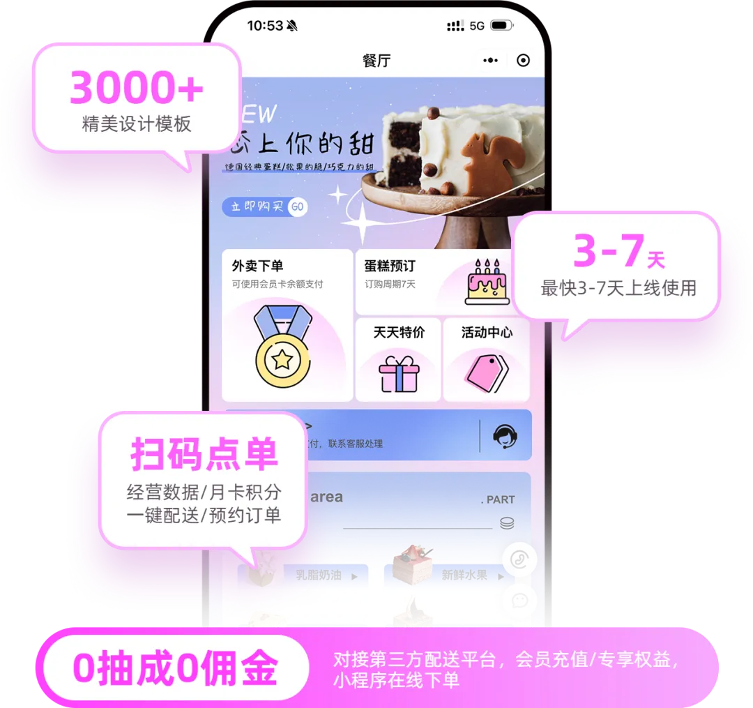 现在做蛋糕店,没有小程序真的跟不上节奏了。不用懂技术、不用花大价钱,2-3天就能上线,既能方便顾客预约,又能引流锁客,比发朋友圈、贴传单实用多了。