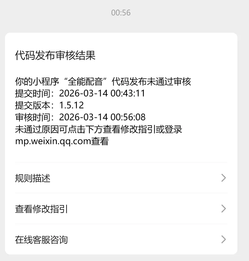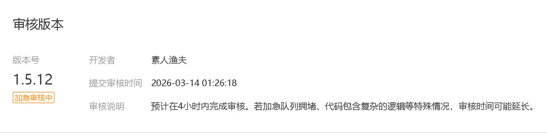 凌晨给全能配音小程序做了部分细节上的优化。然后提交审核的时候,由于需要等待过审后发新版,用了一次加急。使用加急之后,审核速度果然如闪电一样快,仅10多分钟就收到代码审核结果的推送。于是根据修改指引,继续再接再厉,一番修改之后,再次提审。接下来便一直等待,等到凌晨2点、凌晨3点、到现在的凌晨4点……后台显示还是加急审核中第一次加急会在2小时内反馈,如果没通过,再次提审或者不同意审核员的意见发起申诉,审核时间会变成4小时之内。从提交的时间来看,最迟得5点半左右才会有第二次的审核结果了。顺口提一点,关于小程序的审核时间,经过我数以百计的提审,总结出的一些个人判断就是:2、工具类、无支付的小程序审核比其他类型的小程序更快。5、审核被拒后,尽量先不同意再次申诉提审,这样反馈速度比重新提审代码更快(个人感觉)。6、尽可能别在深夜提交审核,哪怕用了加急!如果一次审核通过还好,但要是第一次被拒,再次提审后,几乎一定会很慢,并非玄学或官方说法,这是我多次的亲身经历所得。第二次4小时内反馈结果,通常都会在最后时刻才会收到通知。也不知道是不是值班的审核员带着夜班的脾气在审,或者就是因为单纯的人手问题。7、非加急审核,建议等到白天提审,不要在夜里提,不然可能明天中午也不一定有反馈。但白天提审反馈速度真的很快。(以上仅个人主观观点!!!仅根据多次提审综合体验的个人主观观点!除了多次提审的感受,没有任何实质性的证据,所以不保证真实性)等待往往漫长而煎熬。尤其精神困顿,眼皮沉重,特别想睡觉,但又要等待结果的时候,简直一分一秒都像被拉得长长的橡皮条,绷紧得很难受。写完这些800多字,再刷新小程序的后台,发现状态依旧是加急审核中。已经凌晨4点35分,看来,审核员是打算把审核放到5点钟以后了。