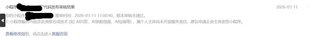 客服说我目前小程序的主体是个人,不能发布面向大众的服务,不能包含任何ai辅助功能,不然审核不通过的,然后就让我修改。