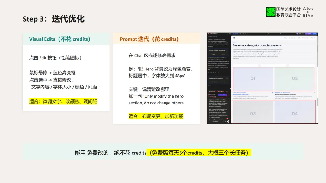 💰 免费版每天有5个credits,大概能完成3个长任务,能用免费改的,绝不花credits!