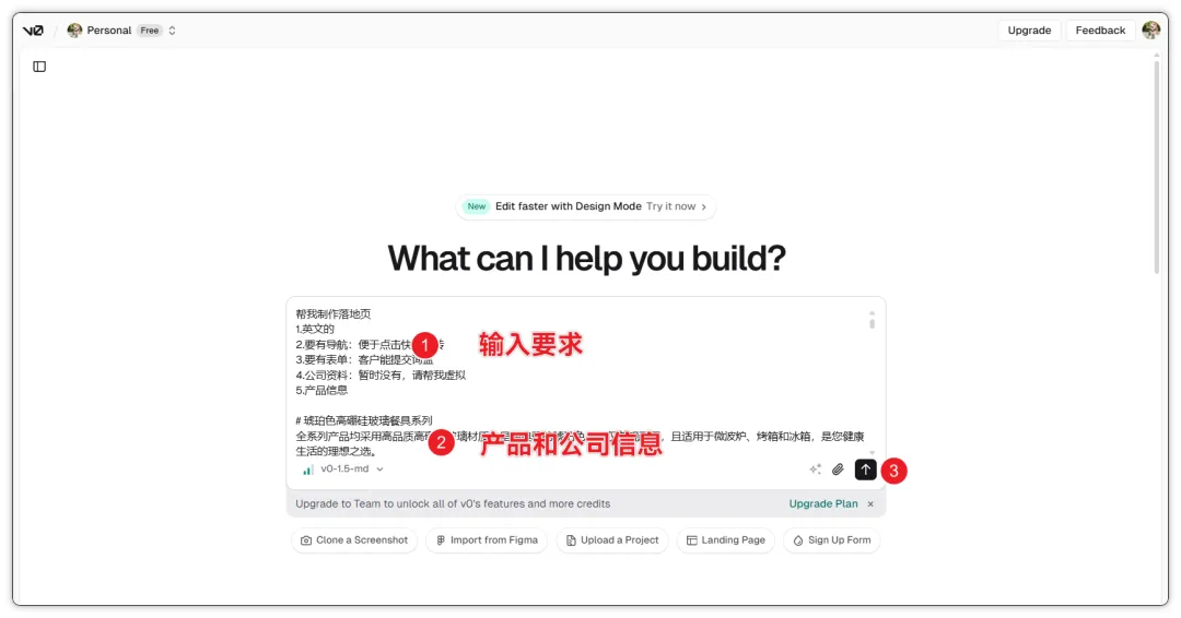 打开v0.dev,在输入框里描述你要什么。