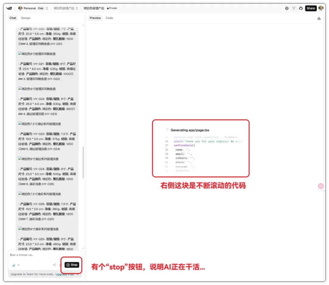 点击发送后,AI开始生成。右侧代码区会不断滚动,等到停下来,一个完整的网站就出来了。