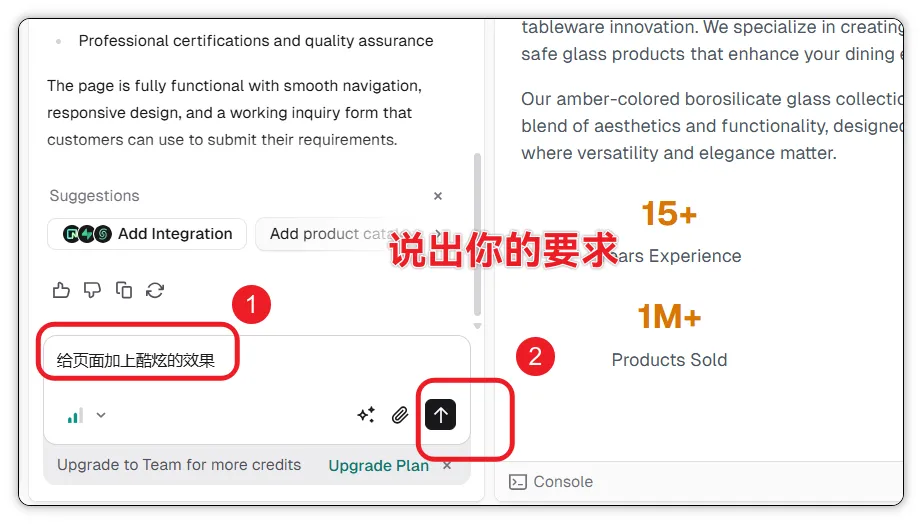 方式一:用AI指令改。 直接在输入框里告诉它你想改什么。比如"页面整体配色换成深蓝色""产品卡片加上悬停动画效果""把联系表单移到页面中间"。AI会理解你的意思然后重新生成。