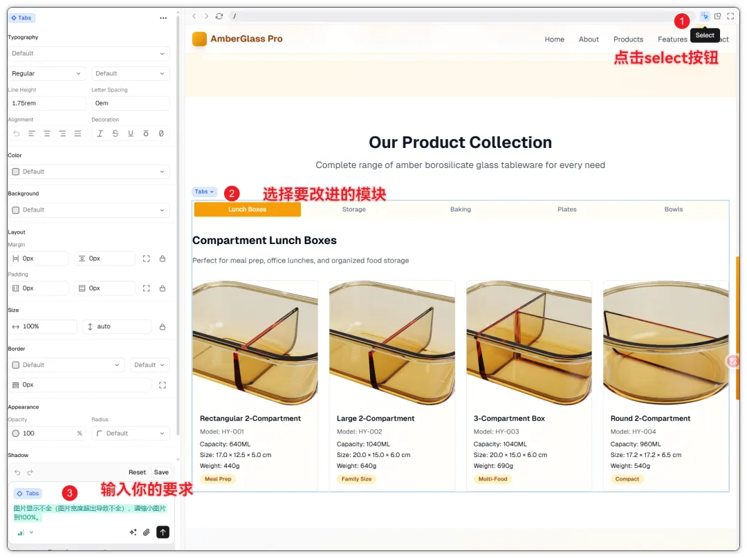 如果你只想改某一个模块,不想让AI动其他地方——点右上角的"Select"箭头,选中那个模块,再输入指令。这样AI只改你选中的部分,其他地方不动。