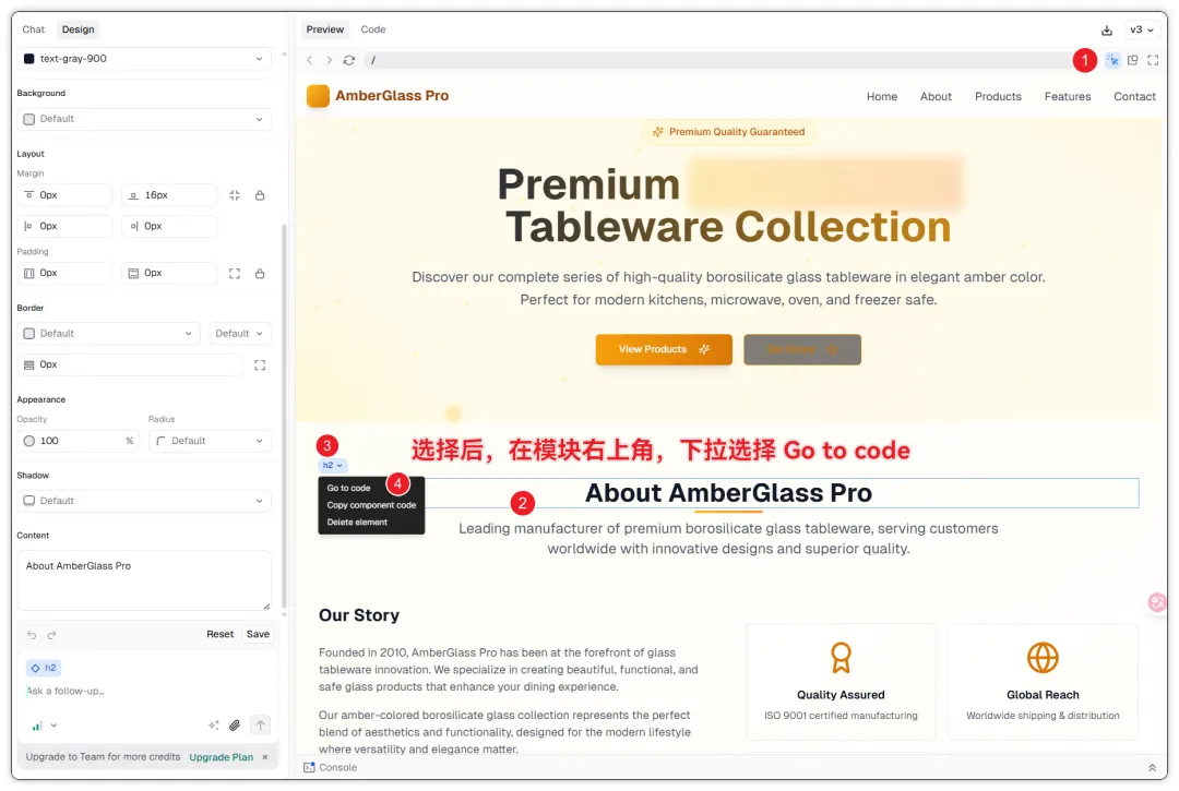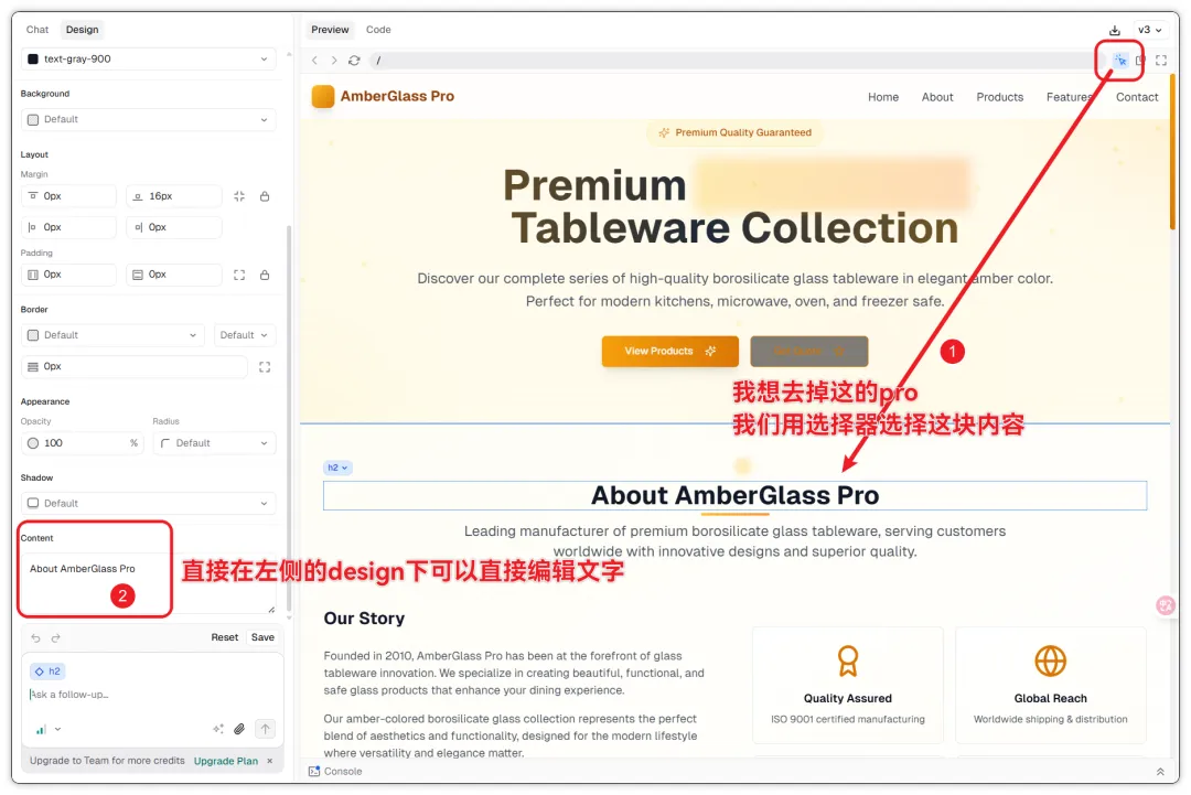 方式二:手动编辑。 这是v0比很多AI建站工具好用的地方。用Select选中页面上的任何文字,右侧会弹出编辑区,直接改就行。改完即时生效,不消耗AI的使用额度。