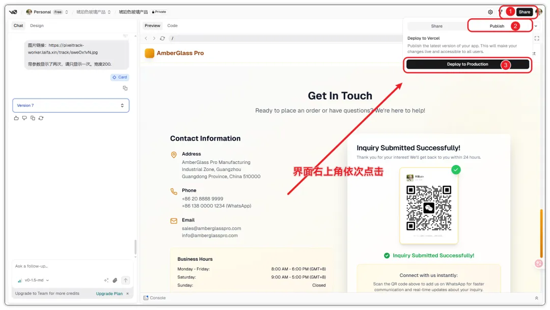 页面改到满意之后,点右上角的 Share → Publish → Deploy to Production。