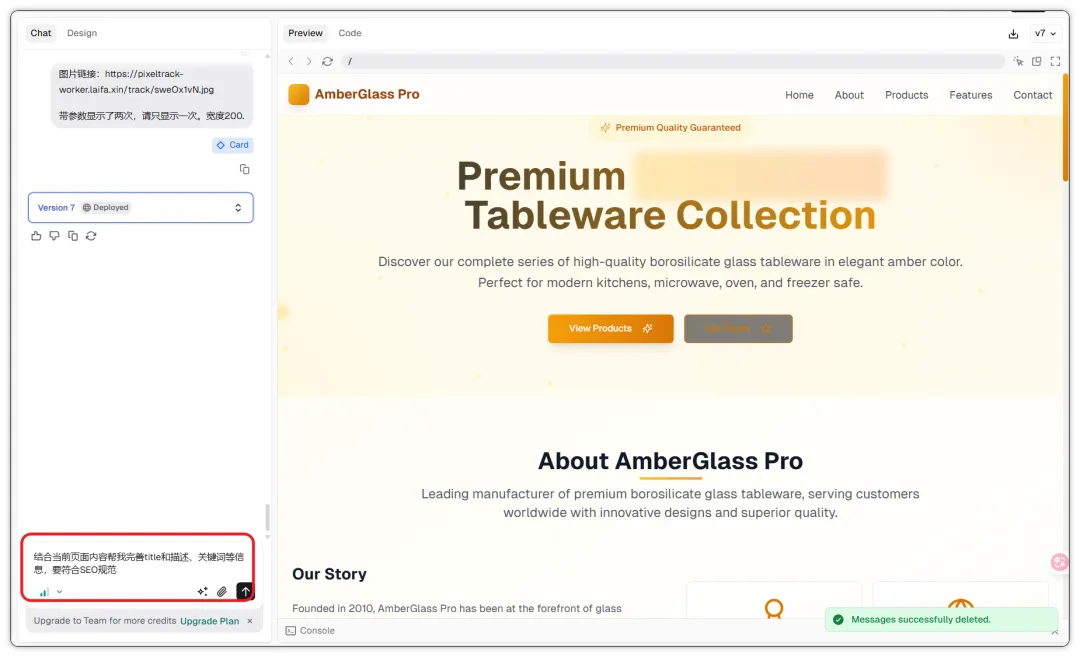 AI会自动生成合适的标题和meta描述。改完重新部署一次就生效了。这一步花10秒钟,但对搜索引擎收录有实际影响。