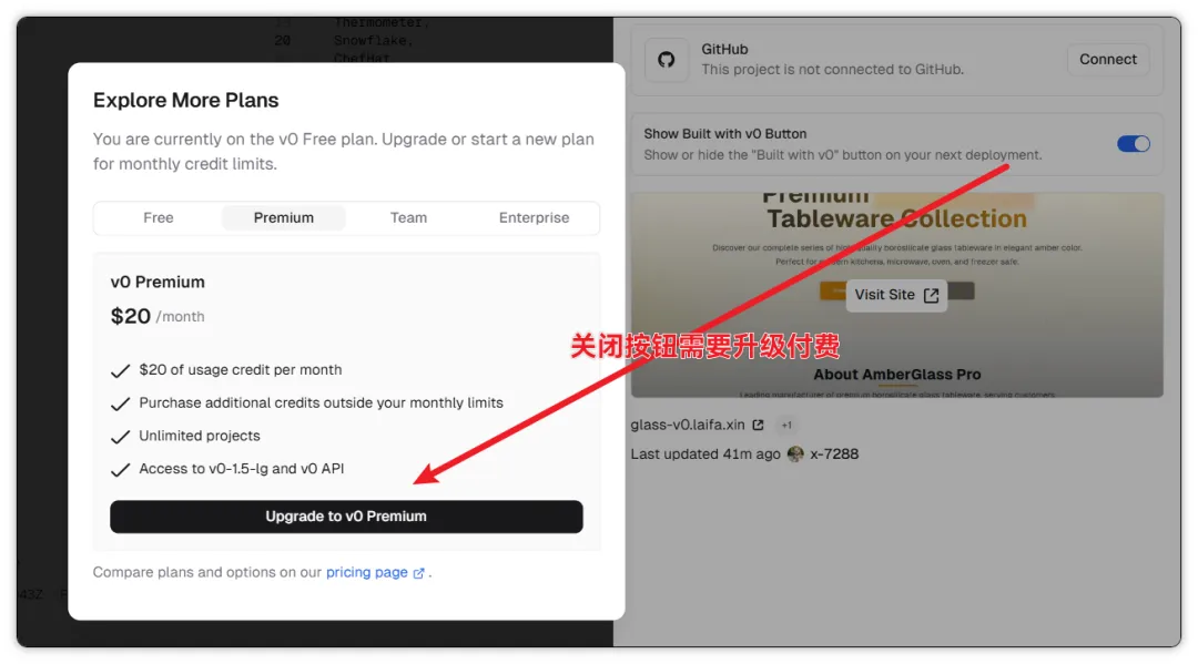 去掉底部标识。 免费版页面右下角有"Built with v0"的图标。在Vercel后台的设置里,免费账户无法关闭这个开关。升级到$20/月的付费版可以去掉。