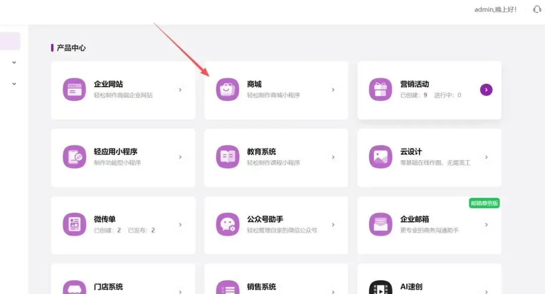 百度“兴尘网络平台”访问,注册登录平台后,进入 “企业中心”,选 “商城模块”(酒店订房本质是服务类电商);
