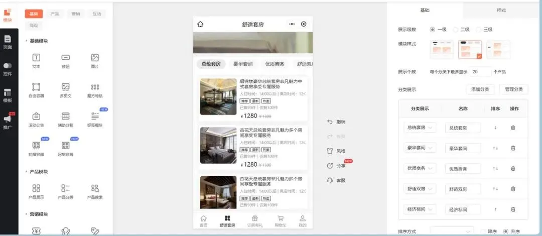 自定义拖拽:从左侧模块栏拖入 “产品展示”“日期选择”“搜索框”“活动 Banner”,调整位置和样式,全程不用写一行代码;