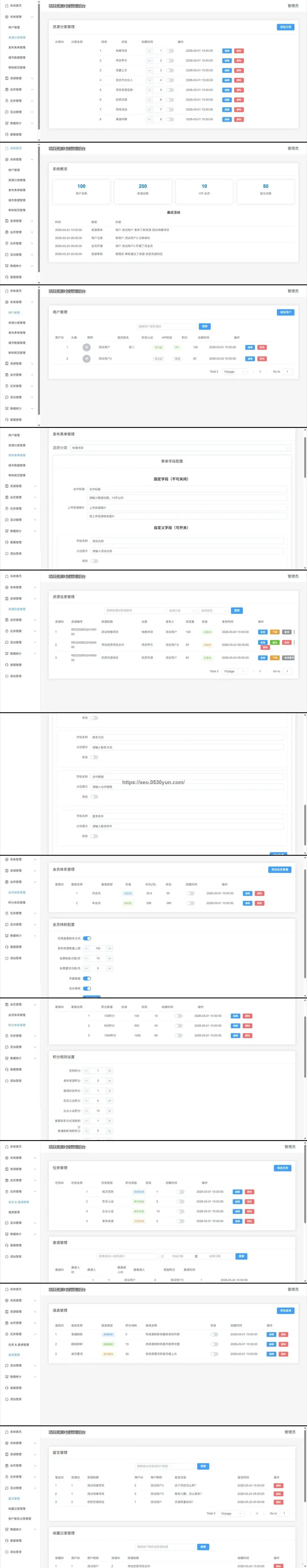 - 数据概览:用户总数、资源总数、VIP会员数、留言总数
