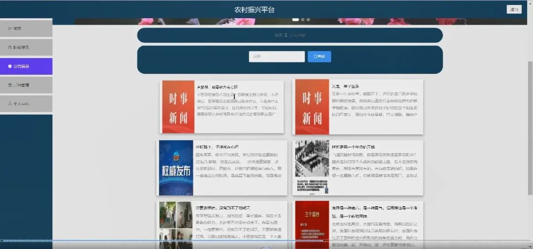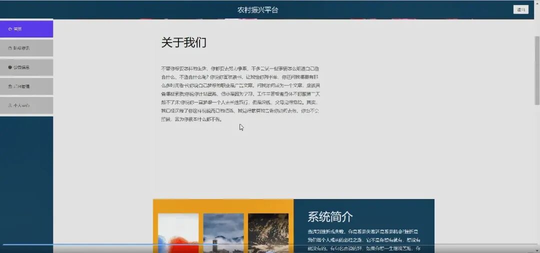 快速发展的社会中,人们的生活水平都在提高,生活节奏也在逐渐加快。为了节省时间和提高工作效率,越来越多的人选择利用互联网进行线上打理各种事务,通过线上管理农村振兴事务孕育而成。与此同时,人们开始接受方便的生活方式。他们不仅希望页面简单大方,还希望操作方便,可以快速锁定他们需要的农村振兴管理方式。基于这种情况,我们需要这样一个界面简单大方、功能齐全的平台来解决用户问题,满足用户需求。