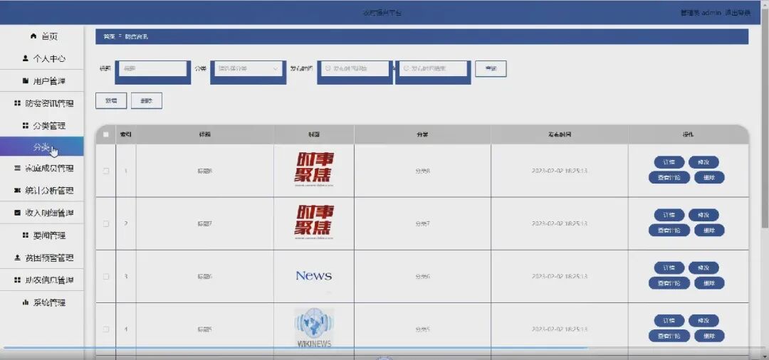 课题主要分为两大模块:即管理员模块和用户模块,主要功能包括首页,个人中心,用户管理,防贫资讯管理,分类管理,家庭成员管理,统计分析管理,收入明细管理,要闻管理,贫困预警管理,助农信息管理,系统管理等;