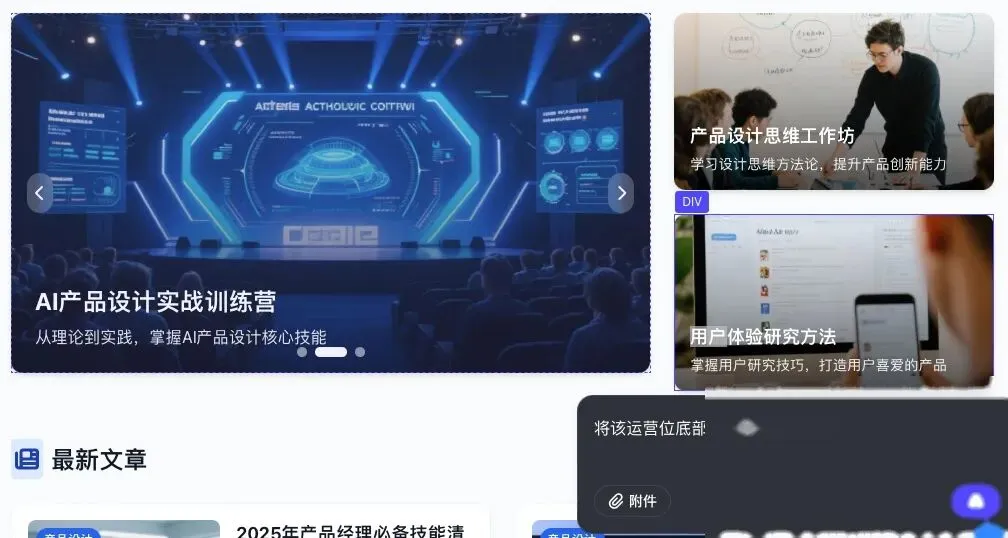 比如,你发现某个图片的位置歪了,或者某个按钮的颜色不对。点击右上角的编辑按钮,直接对AI下指令:“把这个运营位和左边的对齐”,它立马就能帮你改好。