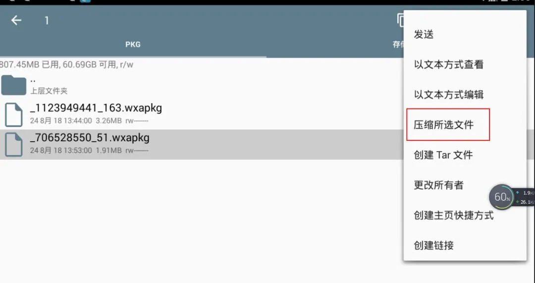 你会看到发现里面的一些.wxapkg后缀的文件,可以根据时间来判断那个是你需要小程序.wxapkg文件,右键长按文件,点击右上角压缩所选文件,然后再将压缩好的包通过微信发送给好友或者文件助手。