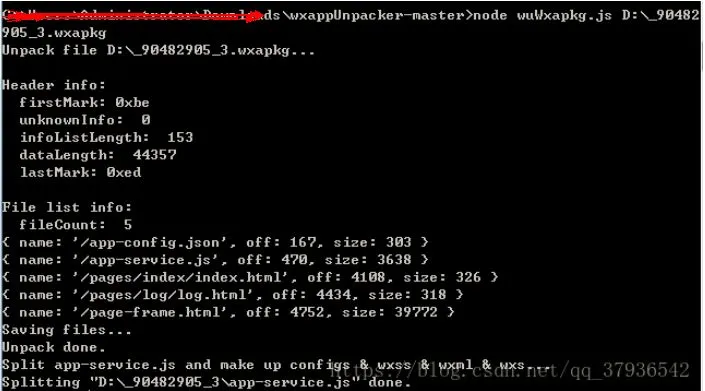例如:我有一个需要反编译的文件 _163200311_32.wxapkg 已经解压到了D盘根目录下,那么就输出命令 node