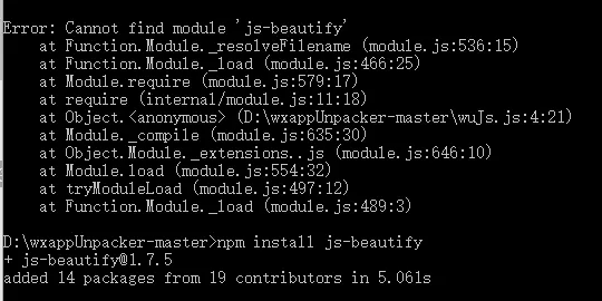 1:使用node wuWxapkg.js 反编译命令时,如果报 Cannot find module 'xxx' 这种类型的错,