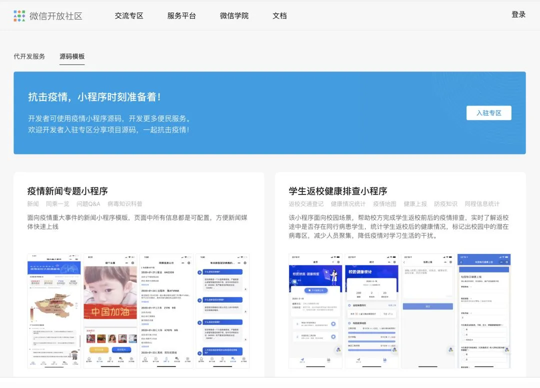 新冠肺炎疫情牵动人心,为便于小程序开发者、服务商便捷、高效开发更多的便民小程序,微信开放社区「服务平台·疫情服务专区」新增疫情小程序开源代码模板,开发者可根据需求接入使用。同时,欢迎开发者报名入驻专区,分享自己开发的疫情小程序模板,为更多的开发者提供参考和支持!我们一同抗击疫情!