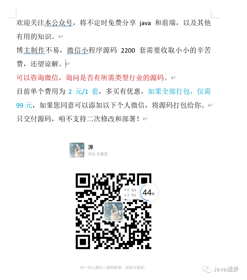 目前单个费用为4元/1套,多买有优惠,如果全部打包,仅需99元,如果您同意可以添加以下个人微信,将源码打包给你。