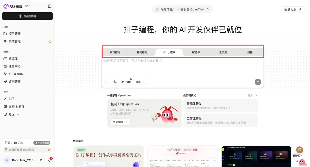 官方地址:https://code.coze.cn包含了网页应用、移动应用、小程序、智能体、工作流以及技能等,你可以按照你的需求进行选择要开发的类目。二、选择小程序类目