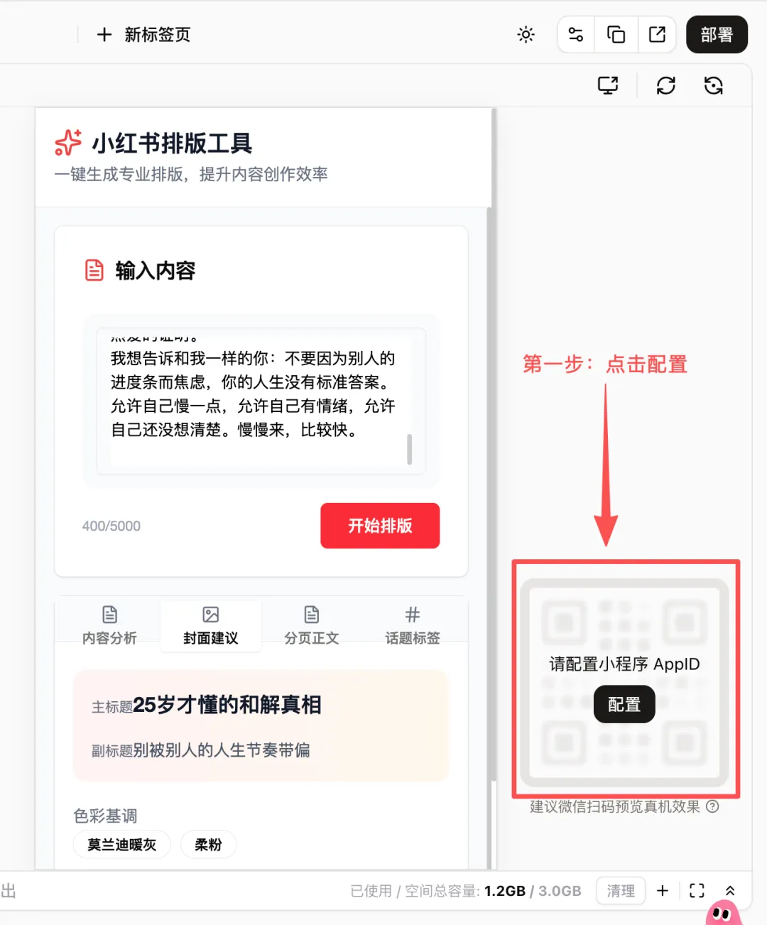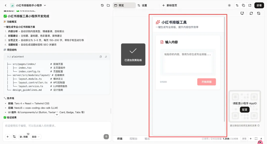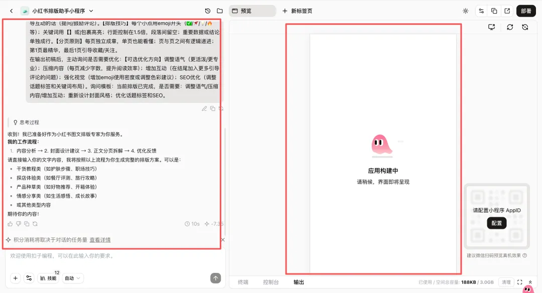在对话框输入提示词,点击发送,扣子就会先针对你的提示词进行分析,然后构建成你的工作流:1.内容分析 → 2. 封面设计建议 → 3. 正文分页拆解 → 4. 优化反馈切记你要按照左侧进行对话,对话完成,你只需要安安静静等待扣子的完成,应用构建以及界面即将呈现。三、小程序的预览