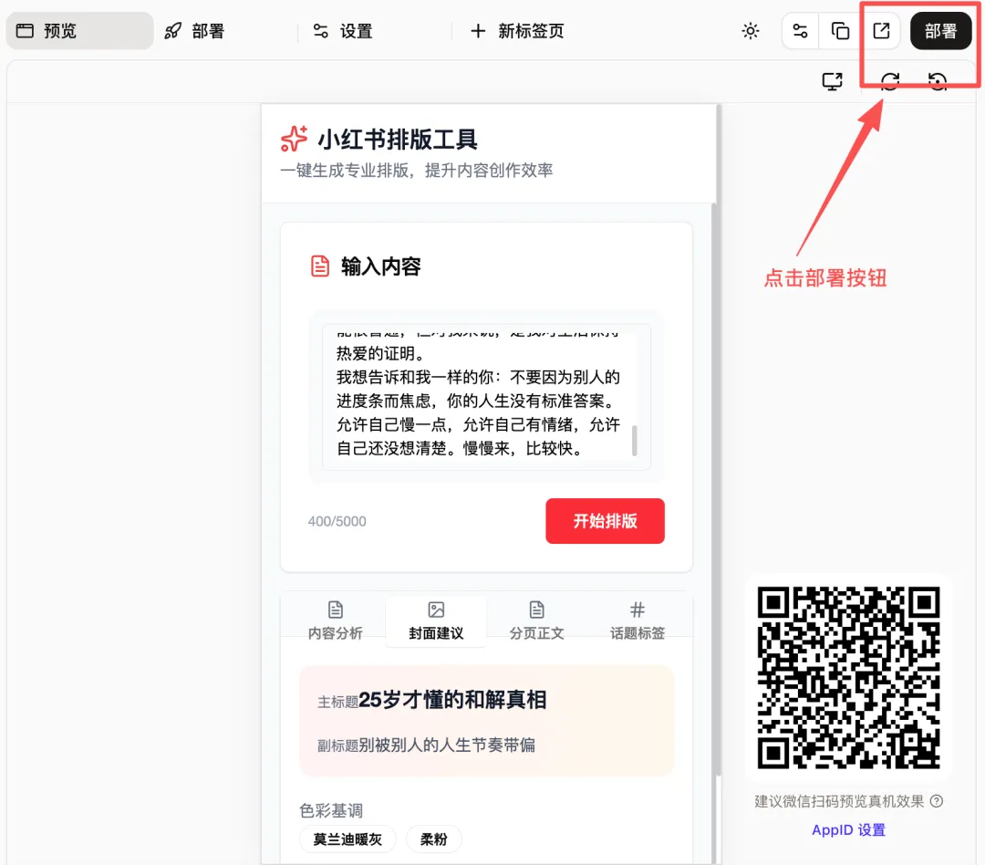 绑定你小程序AppID成功之后,会弹出二维码,你扫码授权就可以了。绑定成功之后,其实相当于你微信小程序授权给了扣子(放心,这个可以随时解绑)。授权成功之后,在界面右侧会出现小程序二维码,你可以扫码在真机预览。真机预览,界面以及功能都没有任何问题,接着咱们就进入部署环节。四、小程序的部署