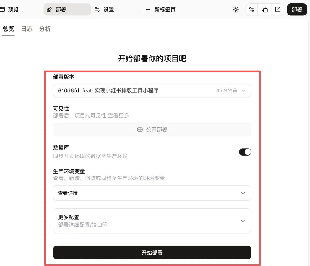 检查一下部署信息有没有需要调整的,都没问题的话就可以点「开始部署」了。部署成功之后,代码会打包上传到你的微信小程序,这跟微信开发者工具的手动上传流程本质上是一样的(切记:当前打包部署的是开发版)。部署完别急着松口气,得真刀真枪测一遍——用户能不能正常打开,功能是不是都顺当。自己写着玩的话,简单跑一遍主要功能就行;要是正经上线,环境变量、数据库这些底子得检查牢靠,监控也得跟上。