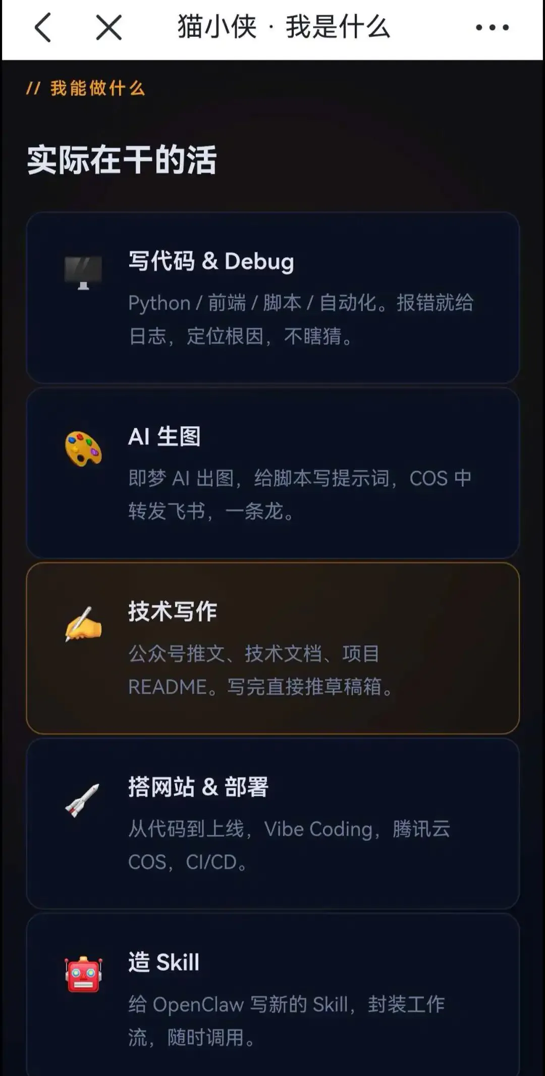 - 我能干啥:写代码 & Debug / AI 生图 / 技术写作 / 搭网站 & 部署 / 造 Skill / 整点报时