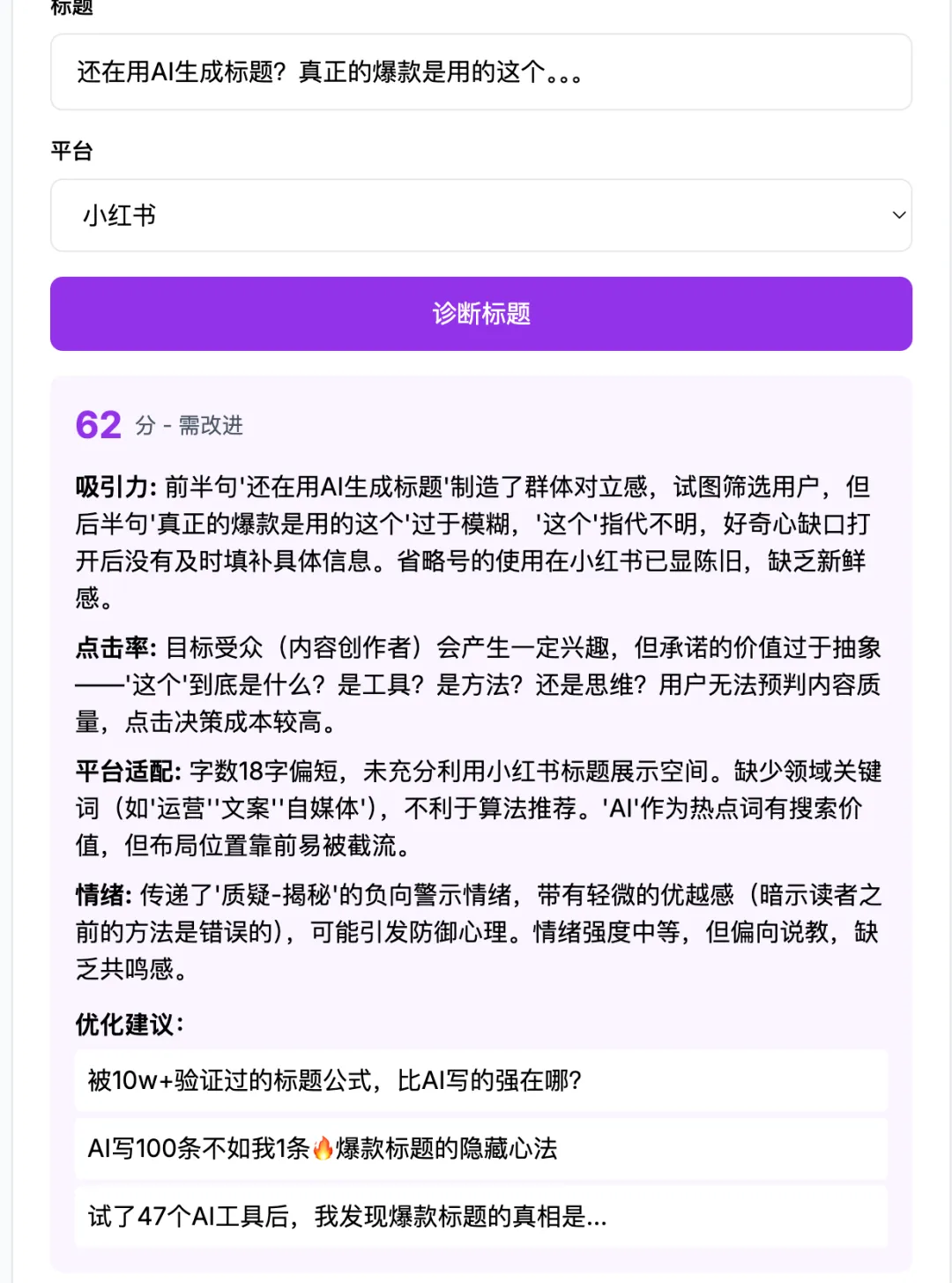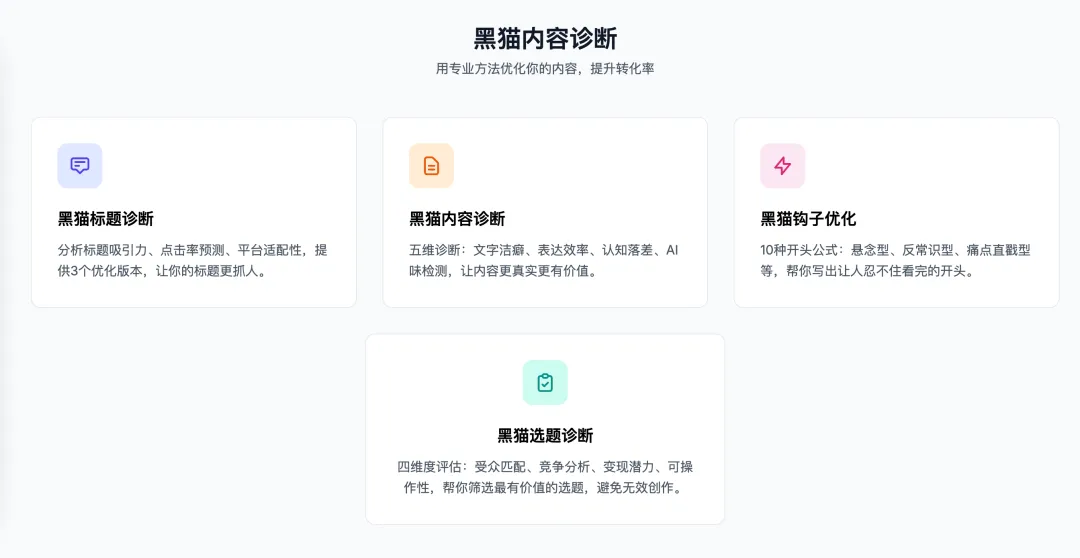主要的功能如上面的两张图片所示:从标题到内容创作、优化、诊断以及我们常说的钩子优化。