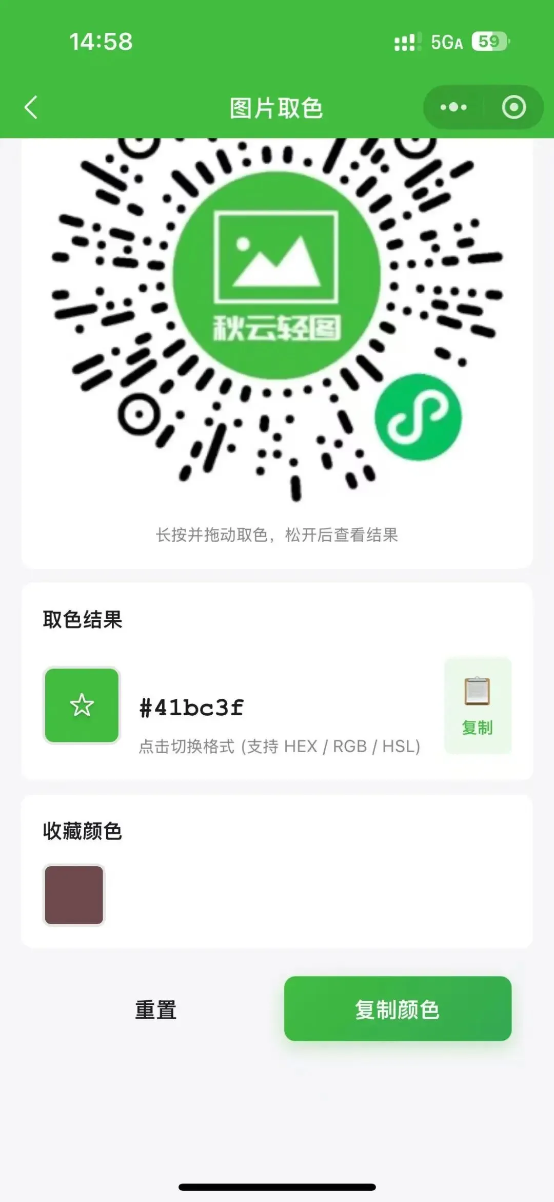 看到一张图里的颜色很喜欢?打开取色功能,点击对应位置,就能获取准确的颜色值。支持 HEX、RGB、HSL 三种格式,一键复制,直接用到你的设计里。