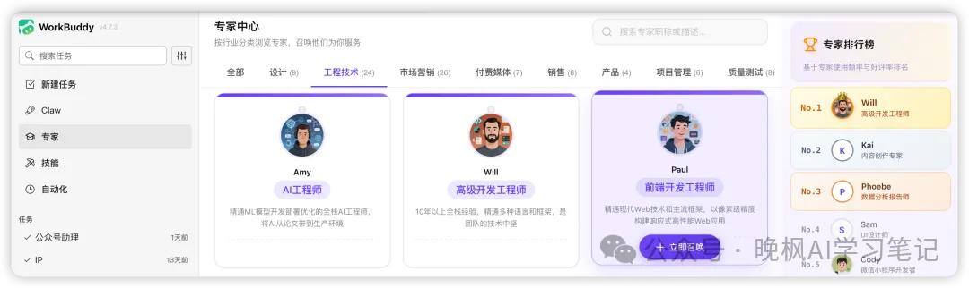 我用的是 WorkBuddy ,打开软件后,先进入「专家中心」,直接选择了「前端开发工程师」专家。