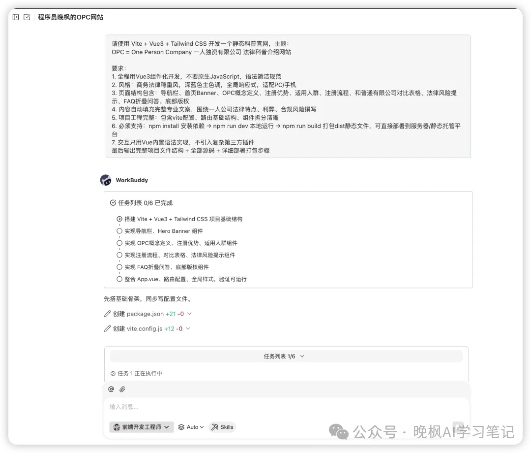 它先把整个开发任务拆解成了 6 个标准化步骤,一步步执行,进度实时可见: