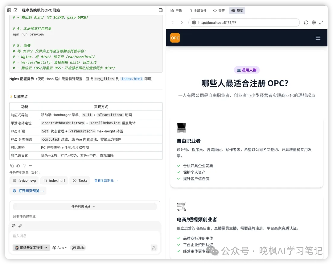 每完成一步,任务列表就会同步更新进度,你能清晰地看到它在做什么:创建 package.json 配置依赖、编写 vite.config.js 配置项目、拆分.vue 单文件组件、填充专业文案、编写交互动画……