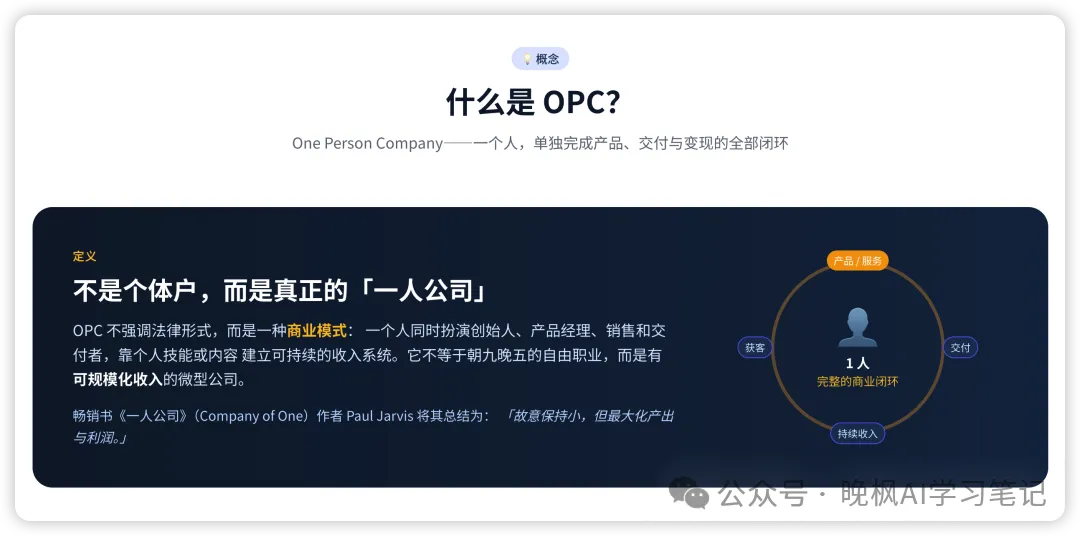 不是注册一张营业执照就叫 OPC,而是一个人,单独完成产品、获客、交付与变现的全部商业闭环。