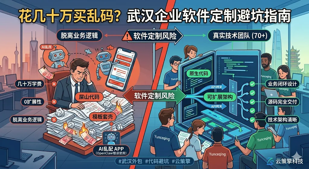 那么到底该怎么筛选一家能打硬仗的供应商?别看他们PPT做得多漂亮,直接拿这三个硬指标去卡:看团队建制与研发纯度:去他们公司看看究竟是打电话的销售多,还是敲代码的程序员多。一个能承接复杂中大型项目的团队,几十人的纯技术规模是及格线。看底层逻辑与抗并发能力:直接让他们演示后台操作,问问某个复杂功能的业务闭环是怎么设计的。如果瞬间涌入一万个并发请求,数据库是怎么处理的。聊十分钟硬核的,懂不懂行立刻原形毕露。死磕源码与知识产权:合同里必须白纸黑字写死:交付完整、未加密的前后端源代码、数据库字典和API接口文档。如果找借口不给源码,本质上就是在卖阉割版的SaaS,以后你的数据就会被他们死死卡住脖子。在我们武汉这个码农重镇,其实并不缺顶尖的技术人才,缺的是踏踏实实懂业务、沉得下心敲代码的团队。作为在这个行业摸爬滚打多年的老兵,我们云策擎科技这些年依靠70多人的纯技术团队,一路实打实地服务了3000多家企业客户。我们从不搞虚假承诺,做不了的业务(比如GEO开发等超出目前业务线的内容)绝不乱接,每天的任务就是和复杂的软件定制、系统打通以及务实的AI落地死磕到底。如果你目前在企业的数字化转型上踩了坑,或者正准备启动一个大项目不知道如何梳理底层需求,欢迎在公众号后台私信留言,我来帮你做一次硬核排雷。